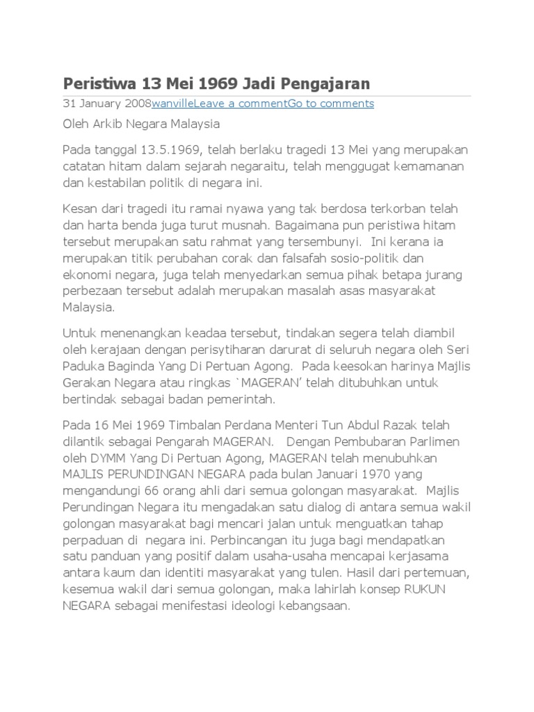 Tragedi ini telah berlaku pada 13 mei 1969 sebaik sahaja selepas pilihan raya 1969 bertempat di kuala lumpur dan sekelilingnya sahaja(selangor). Keratan diatas mendedahkan punca 13 mei 1969. 15 9 cabaran wawasan 2020 membina bangsa malaysia yang bersatu padu. Peristiwa 13 mei pada tahun 1969 ialah insiden rusuhan kaum yang berlaku dan kemuncak masalah perpaduan di malaysia. Sekarang malaysia menjadi sebuah negara yang pesat membangun bersama iklim politik yang sehat. Selepas berlakunya peristiwa 13 mei 1969, kerajaan terpaksa mengeluarkan perintah berkurung yang disebabkan oleh kekacauan dan pecah belah antara kaum. Ini bertujuan untuk mengawal keselamatan rakyat dan mengembalikan kestabilan negara ketika itu. Pengenalan :::peristiwa 13 mei 1969 merupakan satu tragedi berdarah yang banyak meninggalkan kesan terhadap politik , ekonomi dan sosial masyarakat malaysia. Pada tanggal 13 mei 1969, berlaku satu peristiwa hitam dalam lembaran sejarah negara malaysia. Pada tanggal 13/5/1969, telah berlaku tragedi 13 mei yang merupakan catatan hitam dalam sejarah negara ini, telah menggugat kemamanan dan kestabilan politik di negara ini. Peristiwa 13 mei 1969 merupakan satu tragedi berdarah yang banyak meninggalkan kesan terhadap politik , ekonomi dan sosial masyarakat malaysia.peristiwa 13 mei sememangnya bukan suatu peristiwa yang berlaku bsecara tiba tiba atau sebab sebab yang spontan tetapi ianya merupakan. Tragedi ini telah meragut nyawa serta harta benda dan mempunyai kaitan yang rapat dengan pilihan raya umum 10 mei 1969 merupakan satu titik hitam dalam sejarah negara. Kesan rusuhan selepas peristiwa 13 mei yang dirakam.