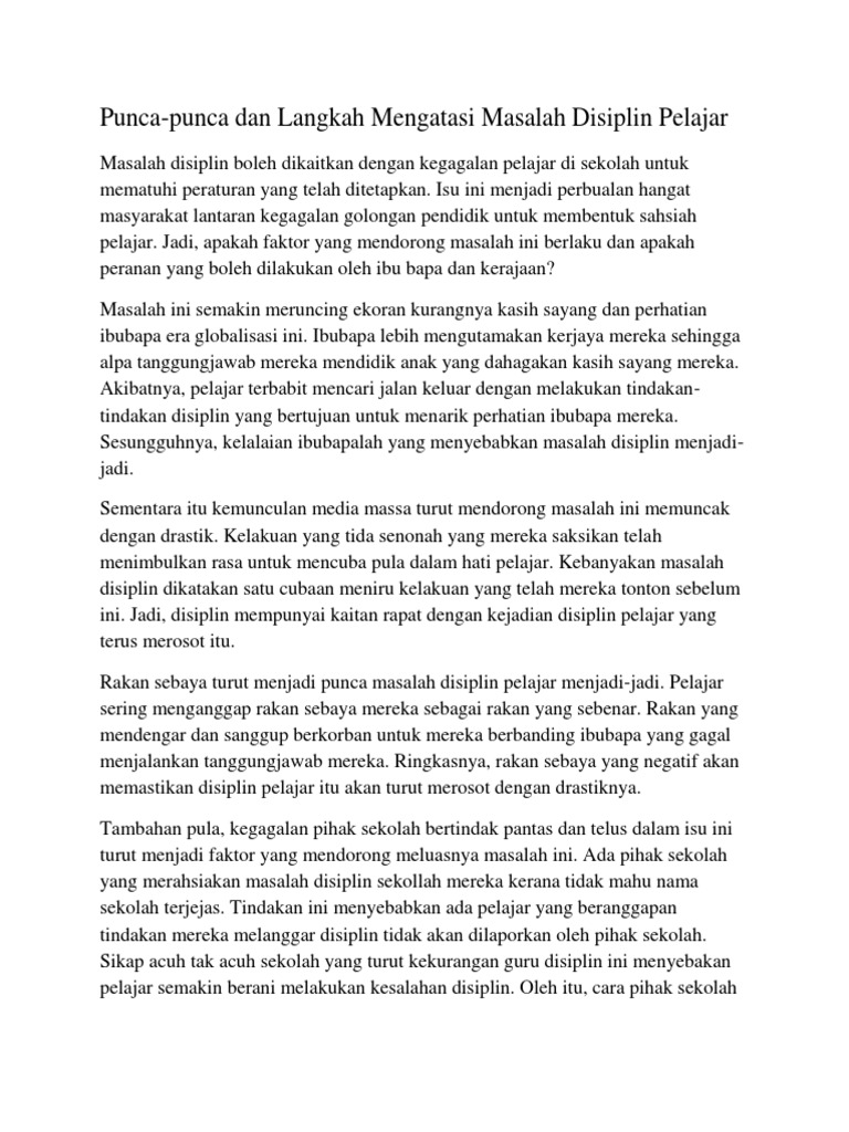 Documents similar to langkah mengatasi masalah disiplin pelajar. Setelah melakukan layanan bimbingan belajar guru hendaknya melihat perkembangan yang terjadi. Isu masalah disiplin, shahrol shiro bidas stesen radio swasta. Masalah disiplin pelajar merujuk kepada perbuatan atau salah laku yang melanggar peraturan yang telah ditetapkan oleh pihak sekolah. Masalah (problem) dapat didefinisikan sebagai suatu pertanyaan yang diinginkan untuk dipecahkan.